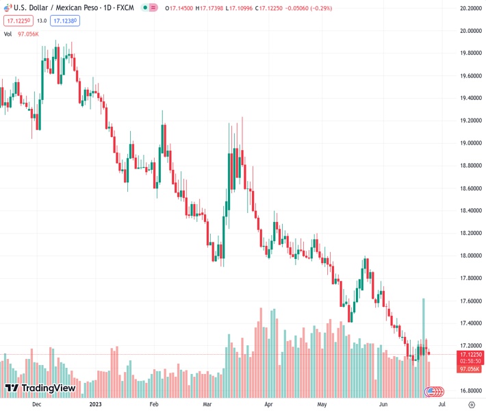 USDMXN currently trading at 17.1253 at the time of writing. Pair opened at 17.1791 and is trading with a change of -0.31 % .