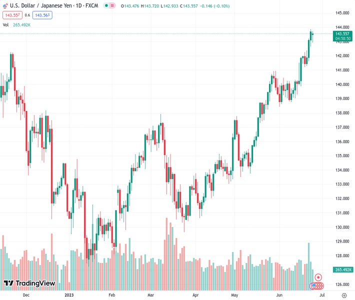 USDJPY currently trading at 143.48 at the time of writing. Pair opened at 143.68 and is trading with a change of -0.14 % .