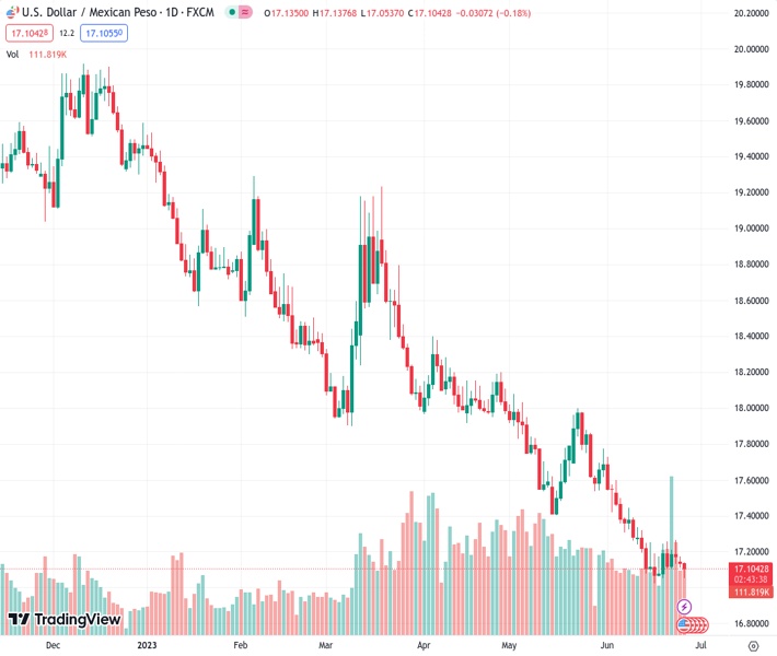 USDMXN currently trading at 17.1081 at the time of writing. Pair opened at 17.137 and is trading with a change of -0.17 % .
