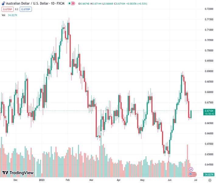 AUDUSD currently trading at 0.6704 at the time of writing. Pair opened at 0.6675 and is trading with a change of 0.43 % .