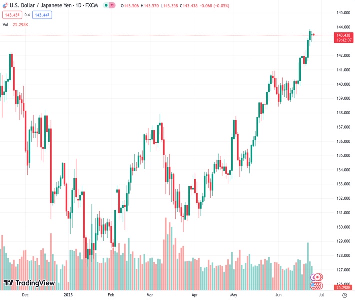 USDJPY currently trading at 143.4 at the time of writing. Pair opened at 143.51 and is trading with a change of -0.08 % .