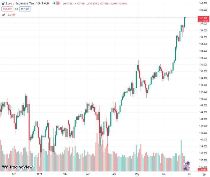 The EURJPY reached its highest point in nearly 13 years, climbing to 157.93 from its previous level of 157.853 in August 2008.