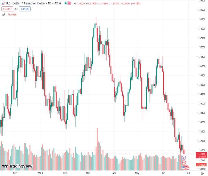 The USDCAD exchange rate at 1.31307 has been on a downward trend for two consecutive days and is influenced by several factors.
