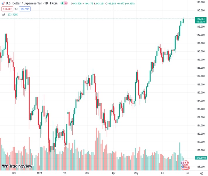 USDJPY currently trading at 143.9 at the time of writing. Pair opened at 143.51 and is trading with a change of 0.27 % .