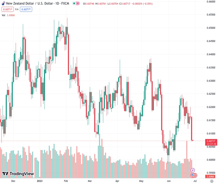 NZDUSD currently trading at 0.6075 at the time of writing. Pair opened at 0.6163 and is trading with a change of -1.43 % .