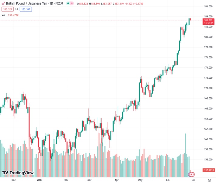 GBPJPY currently trading at 183.27 at the time of writing. Pair opened at 183.67 and is trading with a change of -0.22 % .