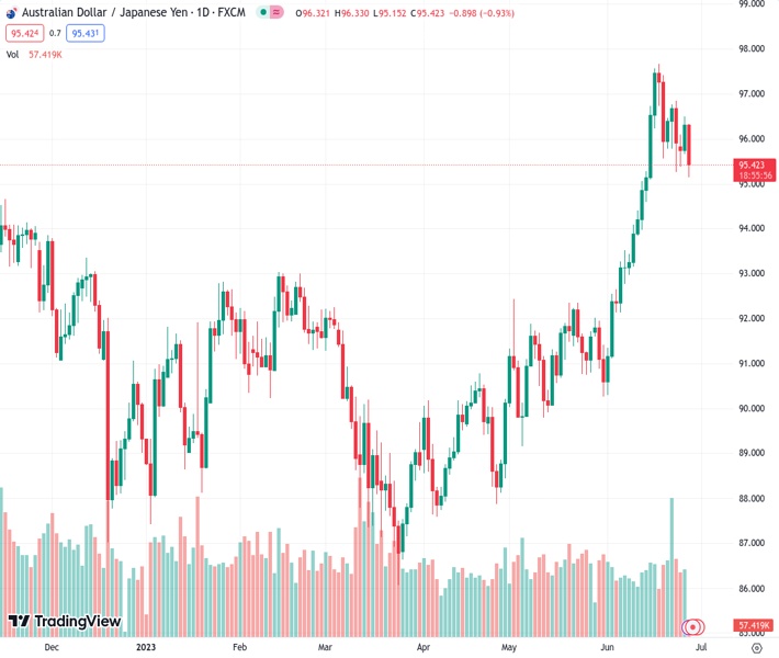 AUDJPY currently trading at 95.9 at the time of writing. Pair opened at 96.33 and is trading with a change of -0.45% % .