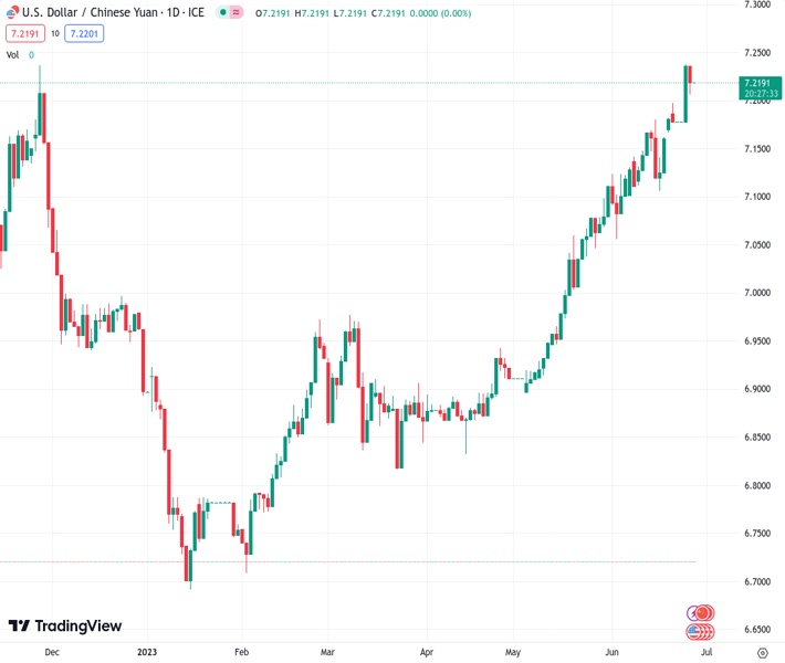 The exchange rate of the US Dollar against the Chinese Yuan has been set at 7.22444, while the People’s Bank of China (PBOC) has established a reference rate of 7.2101, slightly higher than the previous rate of 7.2098.