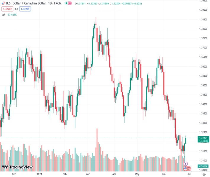 The US dollar to Canadian dollar exchange rate has reached a new weekly high at 1.3230, as it is predicted that the Bank of Canada may not increase interest rates in the near future.