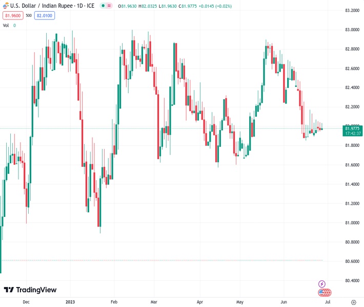 The USDINR currency pair is currently hovering around 81.9700 and is experiencing a decrease in selling prices, reaching a new low for the day. This is consistent with the candlestick formation known as a Doji, which was observed the day before. Analysts, like the user @nehcap, believe that there is unlikely to be a significant decline in the future.