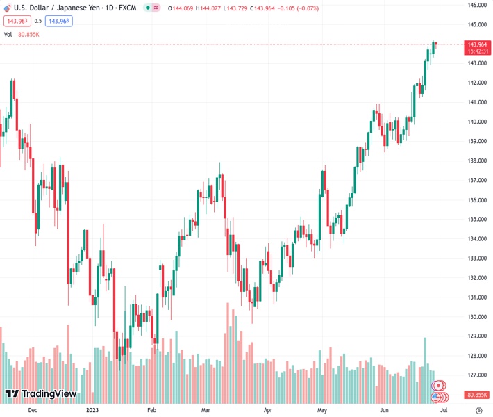 USDJPY currently trading at 143.98 at the time of writing. Pair opened at 144.08 and is trading with a change of -0.07% % .