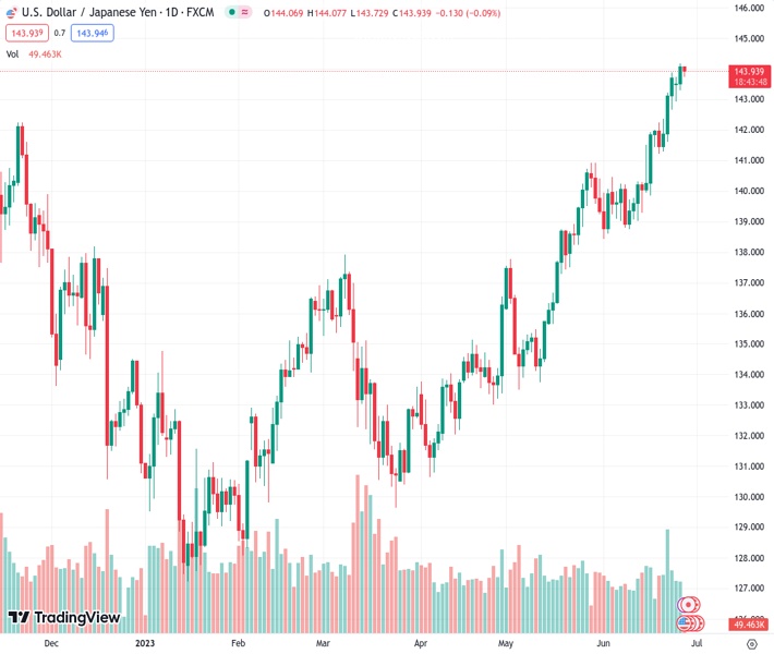 USDJPY currently trading at 143.9 at the time of writing. Pair opened at 144.08 and is trading with a change of -0.12 % .