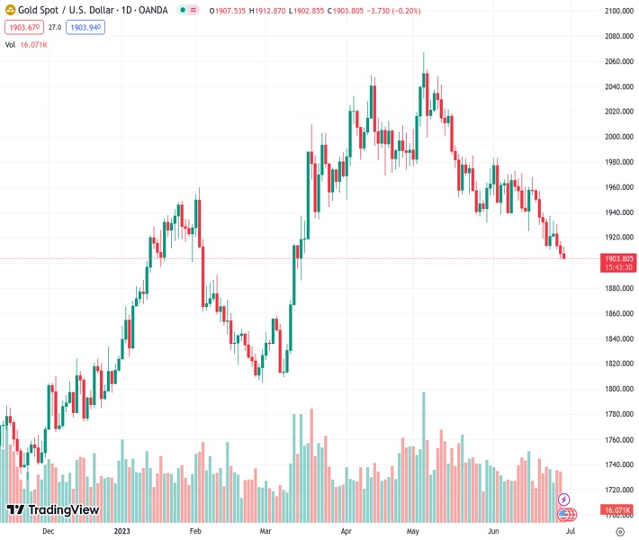 The price of gold, recorded as XAUUSD at 1,903.52, continues to stay low, reaching its lowest point in three months. It is testing a key support level, indicating a sustained downward trend.