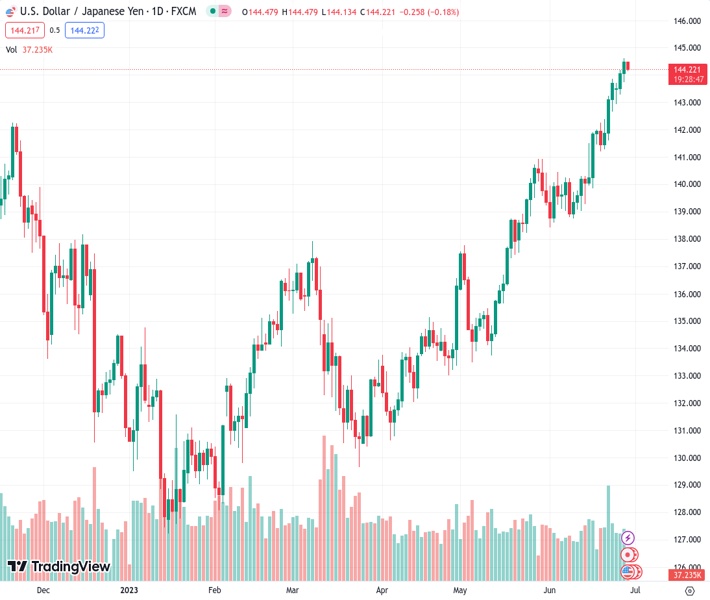 USDJPY currently trading at 144.27 at the time of writing. Pair opened at 144.49 and is trading with a change of -0.15% % .