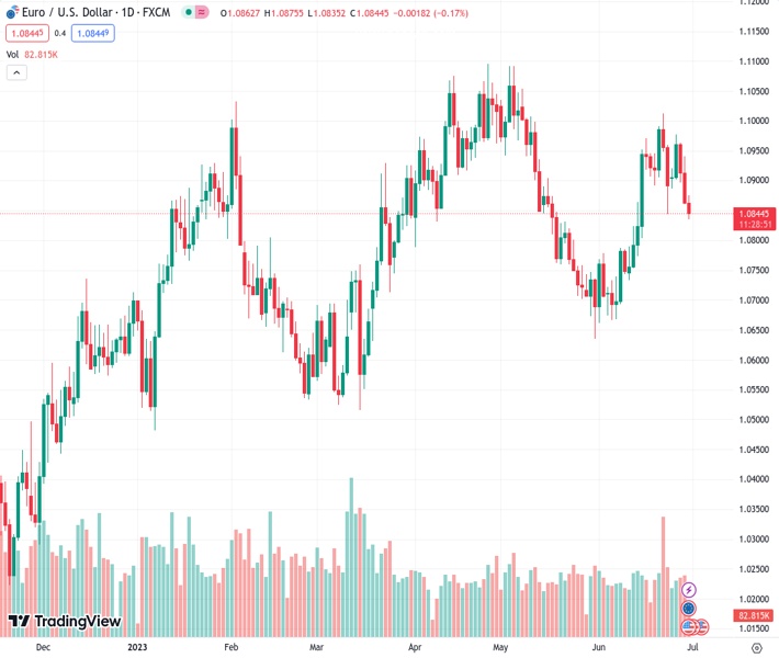 The EURUSD pair, currently at 1.08445, continues to decline for the third consecutive day, reaching a low point not seen in over two weeks on Friday.