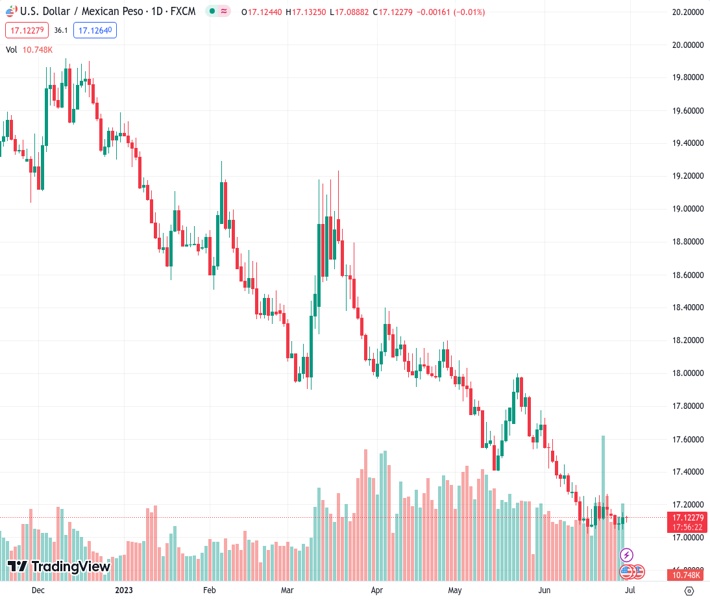 USDMXN currently trading at 17.1164 at the time of writing. Pair opened at 17.1252 and is trading with a change of -0.05 % .