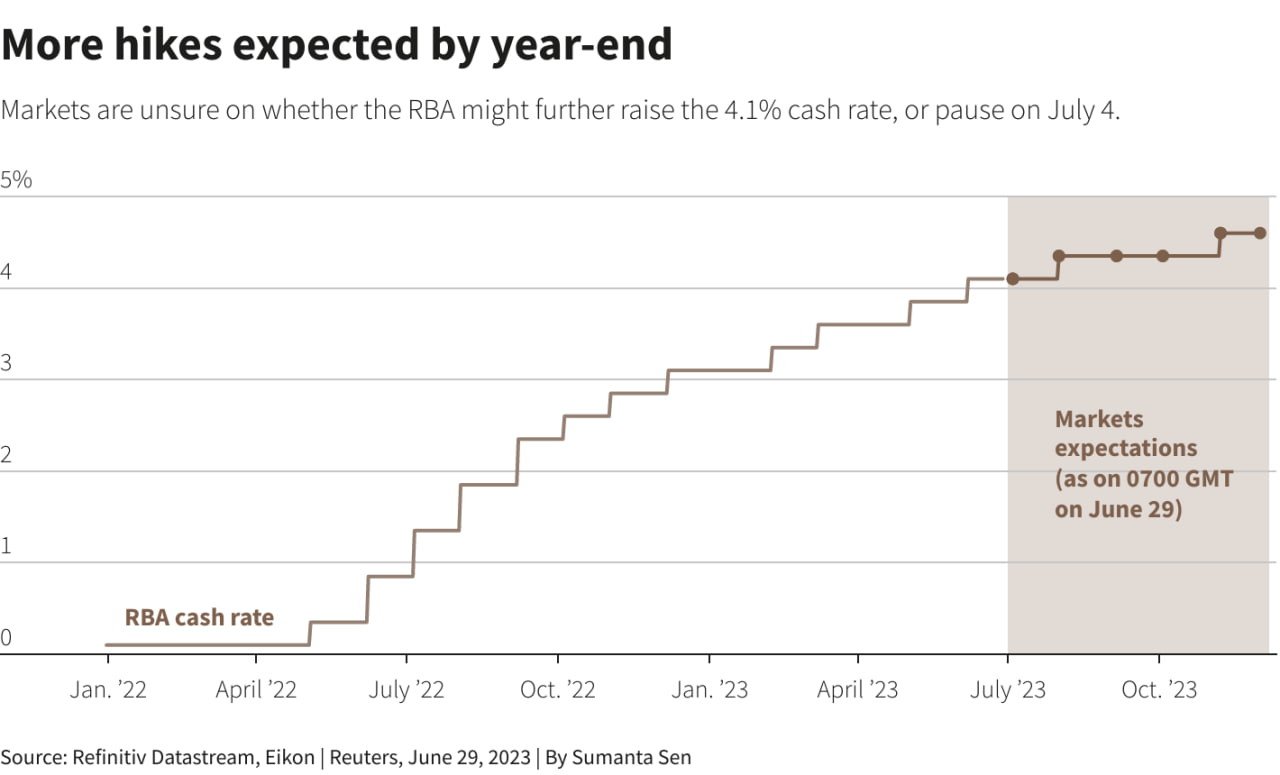 “The combination of the Reserve Bank of Australia’s actions and economic data has caused significant volatility in markets, leading to uncertainty before the highly anticipated policy decision on Tuesday. Despite resilient retail sales data providing some buffer for the possibility of another rate rise, a surprise drop in consumer inflation has prompted a reduction in expectations for tightening measures. As a result, the chances of a third consecutive quarter point increase on July 4 are now only 1-in-3, with the Australian dollar also at multi-week lows. Considering the uncertainty surrounding the previous rate hike in May, caution and flexibility in market predictions are advised.” [/s2If]