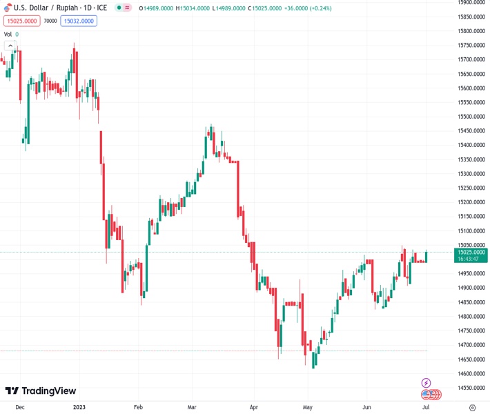The current exchange rate of USDIDR at 15,025.0 is seeking to remain steady above 15,000 as there is a decrease in inflation in Indonesia.