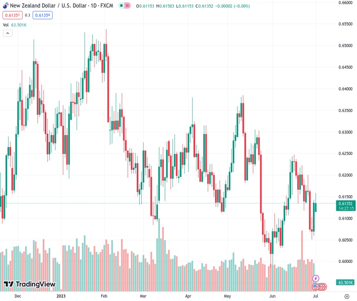 The NZDUSD pair, currently trading at 0.61330, has experienced a slight increase in selling activity near its three-day peak of 0.6160.