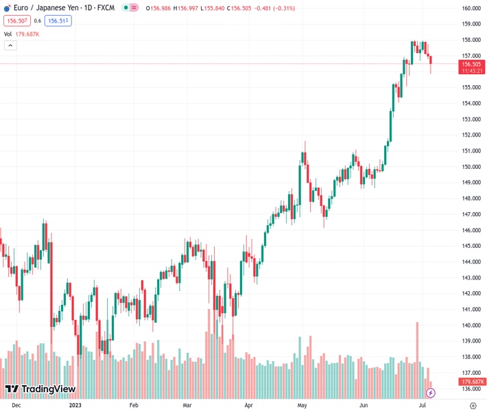 EURJPY currently trading at 156.44 at the time of writing. Pair opened at 157.01 and is trading with a change of -0.36 % .