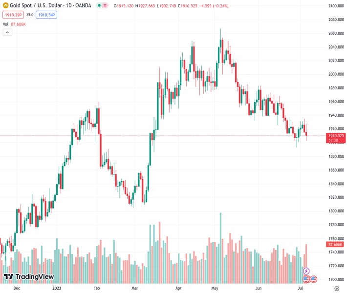 Gold price slides for two consecutive days after a busy economic calendar in the United States (US) emphasized the resilience of the economy, which justifies the Federal Reserve (Fed) 25 bps rate hike at the upcoming July meeting. On Thursday, the XAU/USD, after reaching a daily high of $1927.55, prints losses of 0.20% and exchanges hands at $1910.70.