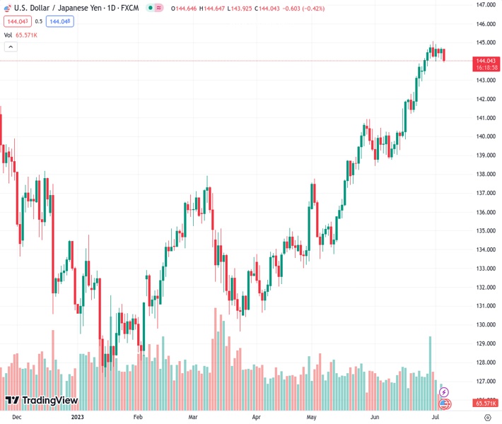 USDJPY currently trading at 144.45 at the time of writing. Pair opened at 144.66 and is trading with a change of -0.15 % .