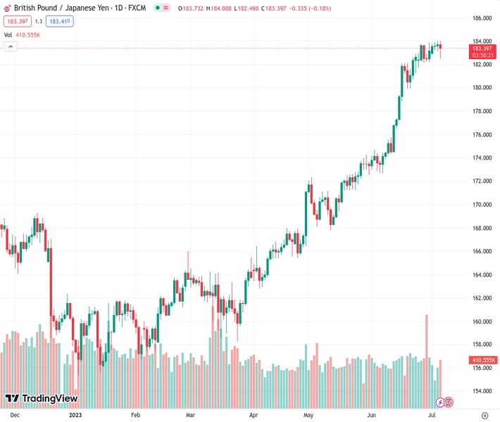 GBPJPY currently trading at 183.47 at the time of writing. Pair opened at 183.78 and is trading with a change of -0.17 % .