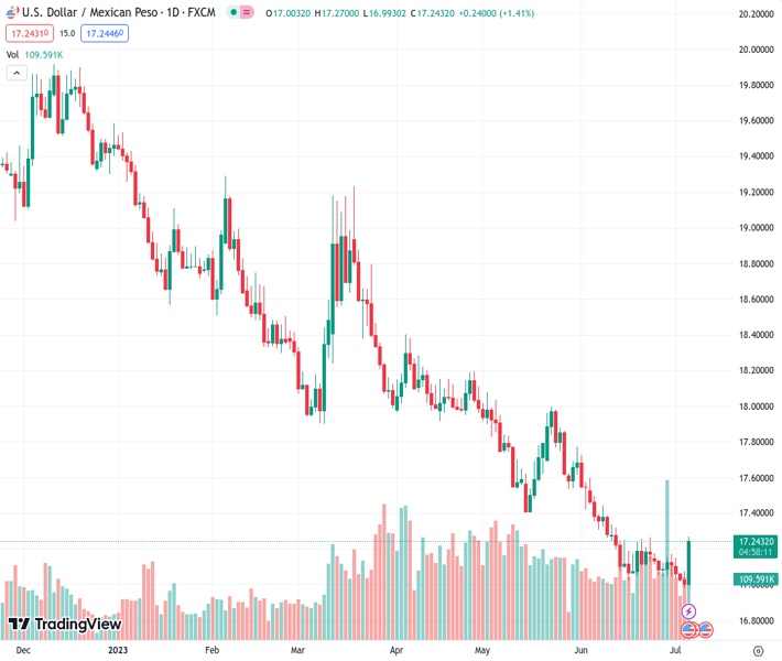 USDMXN currently trading at 17.2174 at the time of writing. Pair opened at 17.005 and is trading with a change of 1.25 % .