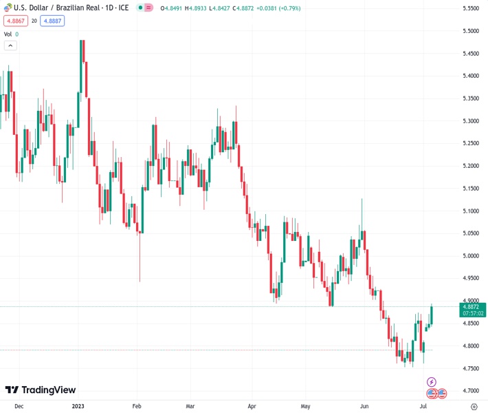 The USD/BRL exchange rate is currently at 4.88540, and the Brazilian Real is expected to remain strong for the foreseeable future. However, there is a possibility of depreciation risks in the coming year, according to Commerzbank.