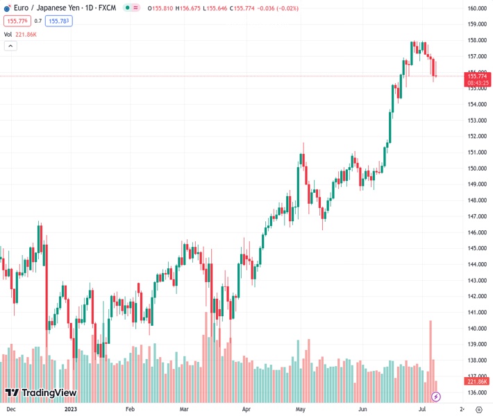 EURJPY currently trading at 155.69 at the time of writing. Pair opened at 155.88 and is trading with a change of -0.12 % .