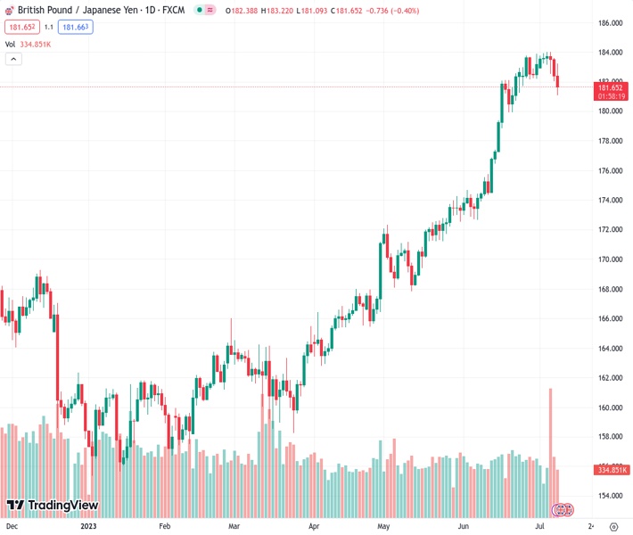 GBPJPY currently trading at 181.65 at the time of writing. Pair opened at 182.49 and is trading with a change of -0.46 % .