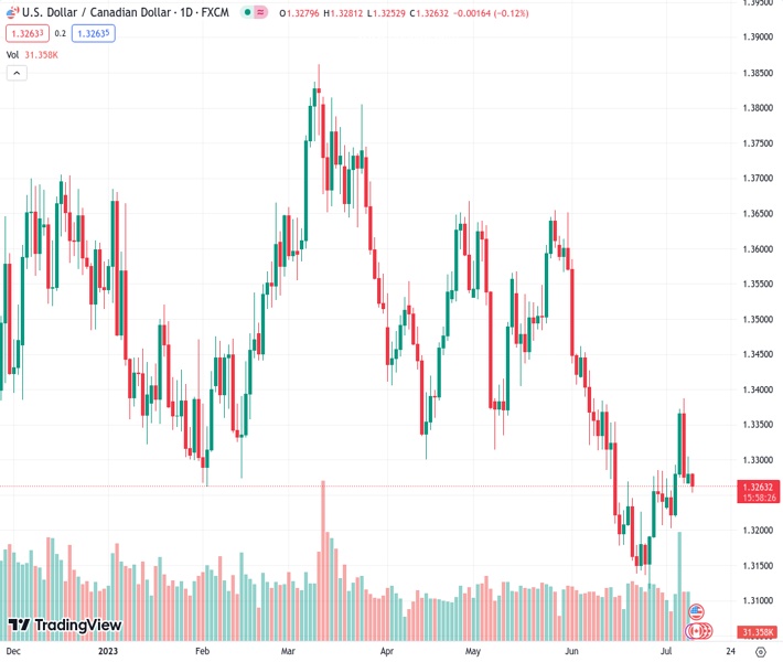 The USD/CAD currency pair encounters a new level of selling pressure on Tuesday at a rate of 1.32640. This is mainly due to a variety of factors contributing to its downward movement.
