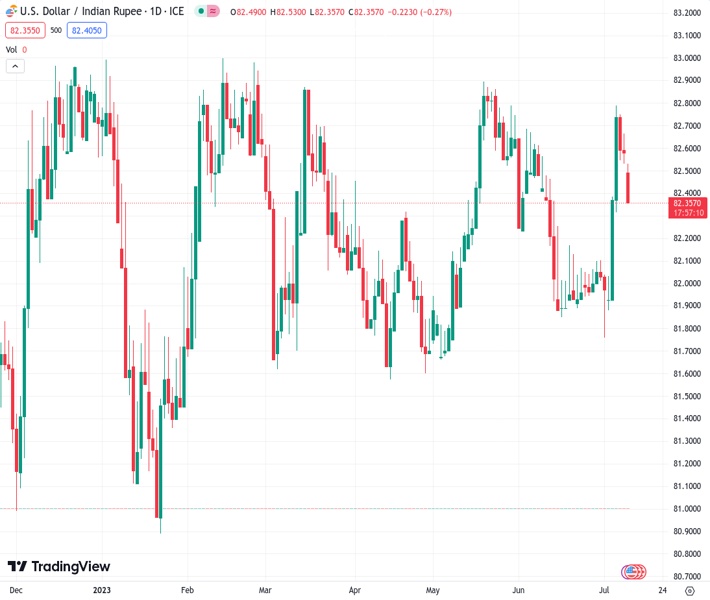 USDINR currently trading at 82.4115 at the time of writing. Pair opened at 82.5836 and is trading with a change of -0.21% % .
