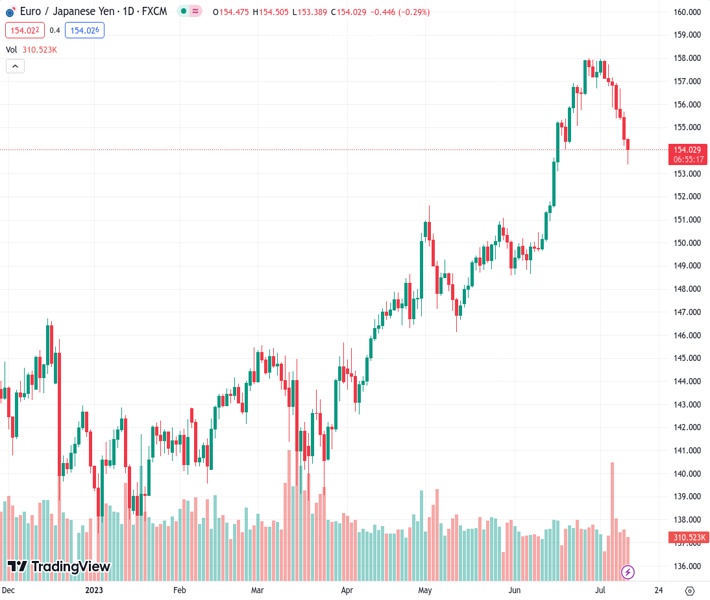 EURJPY currently trading at 154.16 at the time of writing. Pair opened at 154.54 and is trading with a change of -0.25 % .