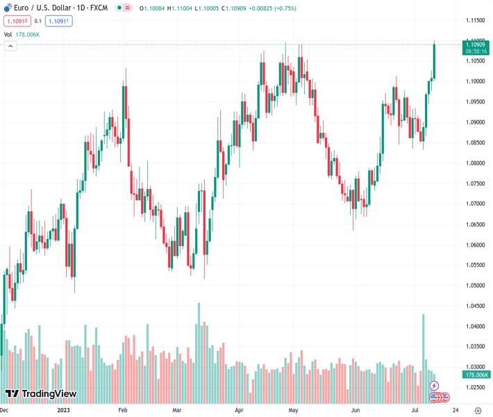 The EURUSD pair, currently at 1.10963, is moving towards higher levels, reaching values close to 1.1100, which are considered new highs.