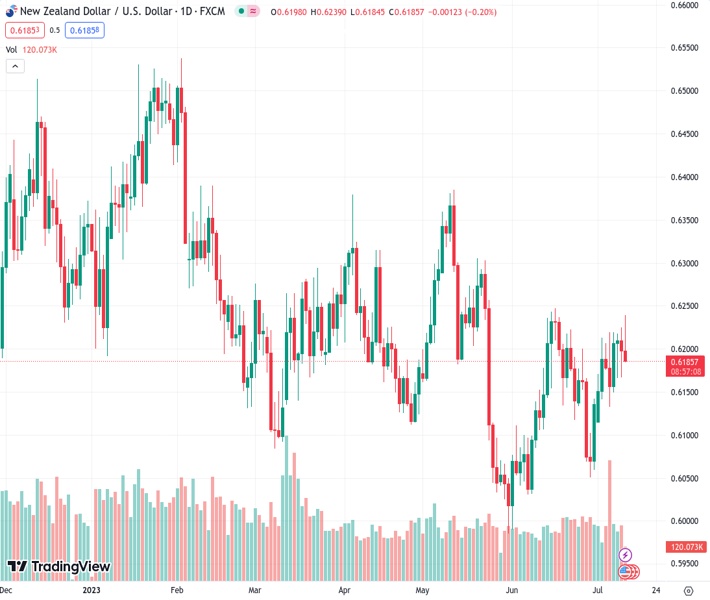 NZDUSD currently trading at 0.6187 at the time of writing. Pair opened at 0.62 and is trading with a change of -0.21 % .