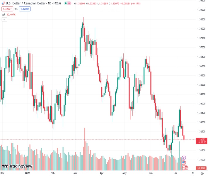 USDCAD currently trading at 1.3206 at the time of writing. Pair opened at 1.323 and is trading with a change of -0.18 % .
