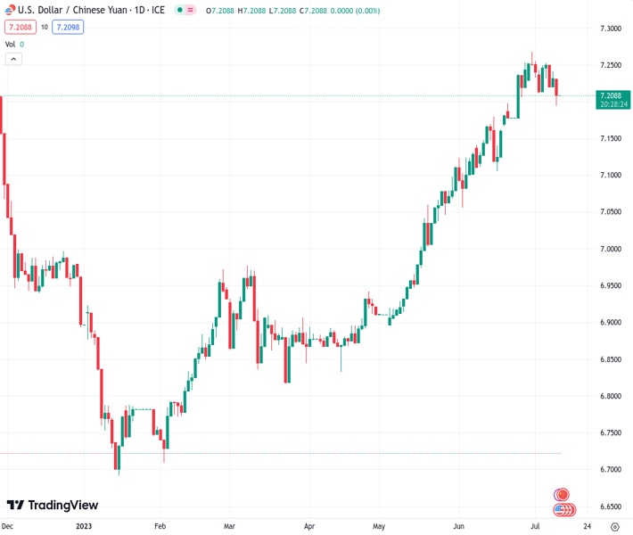 The USDCNY exchange rate is currently at 7.20022, while the People’s Bank of China has set the reference rate at 7.1765, compared to the previous rate of 7.1886.