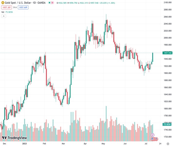 On Wednesday, the Gold spot XAU/USD gained more than 1% and jumped to a daily high of $1,958. In that sense, the yellow metal gained ground following the report of soft inflation figures from the US, which fueled a decline in US yields. In the meantime, the DXY index stands at its lowest level since April 2022, and the Federal Reserve Beige Book report failed to trigger a recovery.