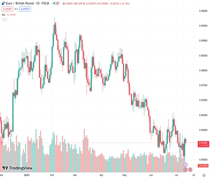 EURGBP currently trading at 0.8549 at the time of writing. Pair opened at 0.857 and is trading with a change of -0.25 % .