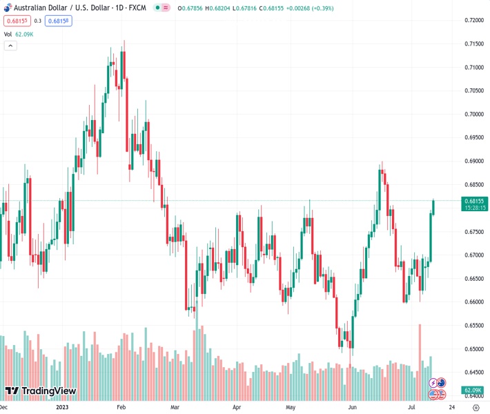 The AUDUSD pair, currently at 0.68166, is experiencing increased momentum, leading its value to rise to a level above 0.6800, which is the highest it has been in three weeks.