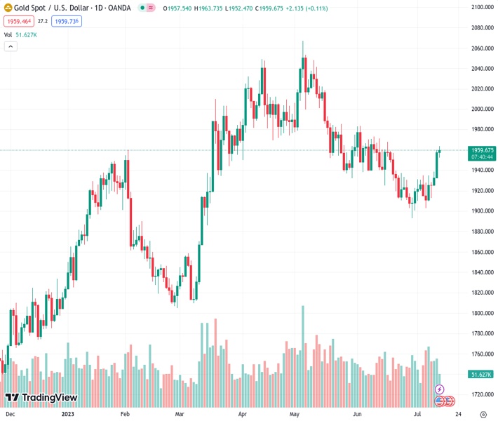 Gold price (XAU/USD) is demonstrating a non-directional performance around $1,960.00 as investors are awaiting United States Producer Price Index (PPI) data for further guidance. The US Dollar Index (DXY) is struggling to find any intermediate support as investors are hoping that the Federal Reserve (Fed) could tweak its old commentary of ‘two more rate hikes are appropriate’ after June’s soft inflation report.