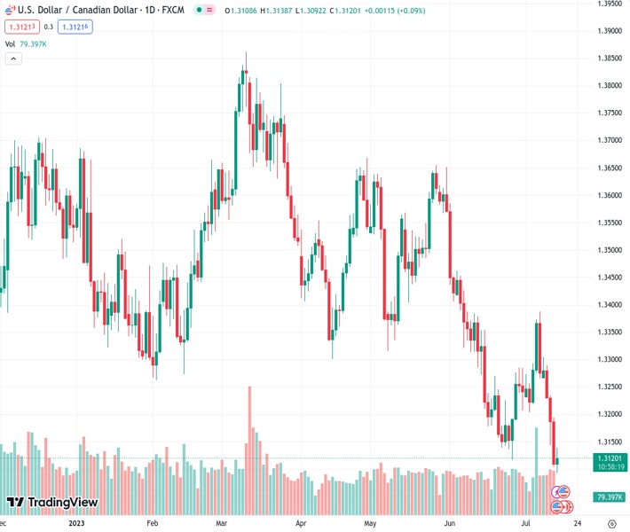 According to SocGen, the USDCAD exchange rate at 1.31175 is expected to continue decreasing.
