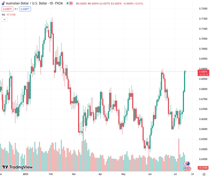 Bulls in #AUDUSD, currently at 0.68859, are momentarily stopping their upward momentum following a recent climb to the highest level seen in almost a month.