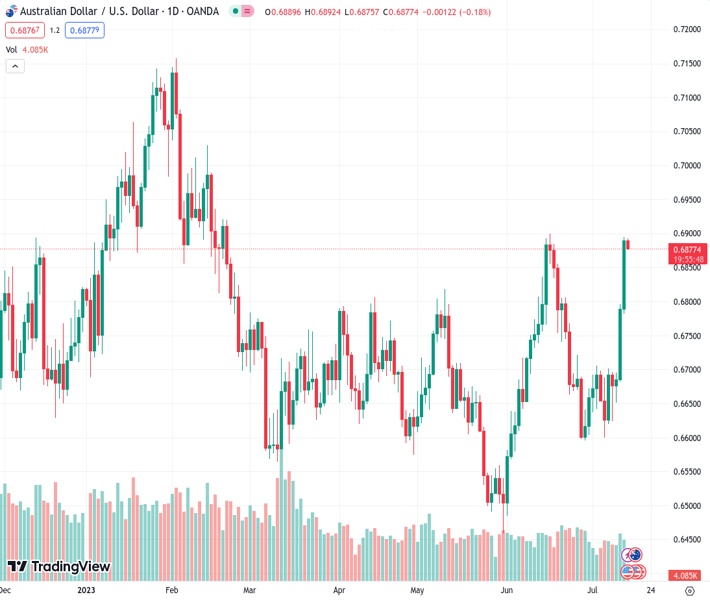Previously, a slump in the US Consumer Price Index (CPI) probed the Federal Reserve (Fed) hawks and drowned the US Dollar, which in turn propelled the AUD/USD price to a multi-month high. On Thursday, US Producer Price Index (PPI) came in as 0.1% YoY for June, versus 0.4% expected and 0.9% prior while the PPI ex Food & Energy, also known as the Core PPI, eased to 2.4% YoY from 2.8% previous reading and 2.6% market forecasts. Earlier in the week, the US Consumer Price Index (CPI) registered a 3.0% YoY figure for June versus 3.1% market forecasts and 4.0% reported for May. Further details suggest that the CPI ex Food & Energy, also known as the Core CPI, softened to 4.8% yearly for the said month compared to analysts’ estimations of 5.0% and 5.3% previous readings.