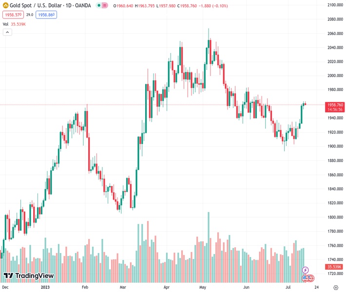 • Gold price (XAU/USD) is demonstrating a non-directional performance from Thursday after a stalwart rally to near $1,960.00. The precious metal has failed to capitalize on soft inflation and Producer Price Index (PPI) June report, which cleared that households’ demand has turned subdued and the path towards the 2% inflation target is intact.
