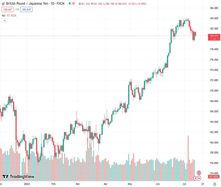 GBPJPY currently trading at 180.68 at the time of writing. Pair opened at 181.34 and is trading with a change of -0.36 % .
