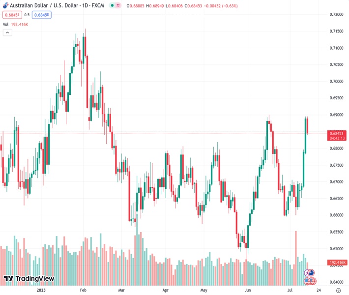 The AUDUSD pair, currently at 0.68431, has fallen below the 0.6850 mark. However, it is still expected to achieve a weekly gain of 2.40%, which would be its highest performance in the year 2023.