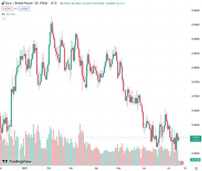 The EURGBP currency pair, trading at 0.85562, sees a slight increase in value on the final day of the week, although there is a lack of sustained purchasing activity.