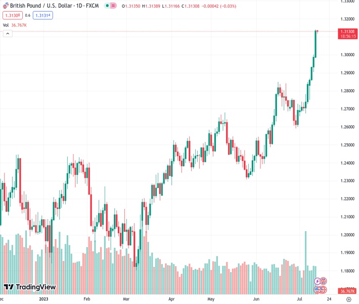 The GBPUSD currency pair is currently at a rate of 1.31299 and is experiencing a period of consolidation, indicating a bullish trend. It is trading slightly below its highest level in the past 15 months.